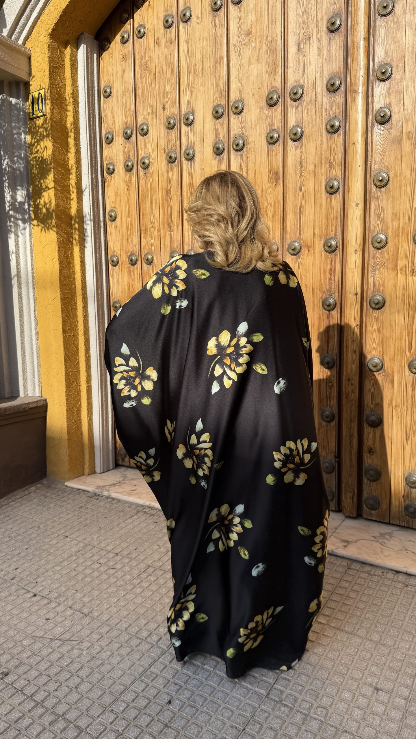 Vestido largo de satén negro con estampado floral en tonos dorados y verdes. Su diseño tipo kaftán de manga amplia y nudo central con caída fluida crea un efecto elegante y favorecedor, ideal para eventos especiales o noches de verano con estilo.